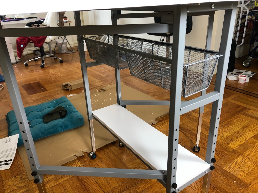 Besides those minor issues, everything arrived in great condition and was noticeably well packaged. I didn’t keep track of the time but I think it took me like two hours to put together. I was worried that it would be too short but 39.25 inches is the perfect height for me to stand and cut. The table, which includes two baskets, is sturdy, long AF, and rolls well on my creaky floors.